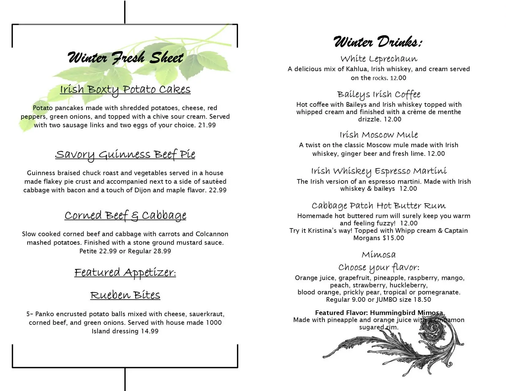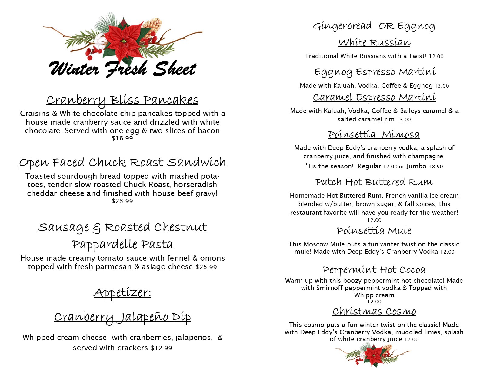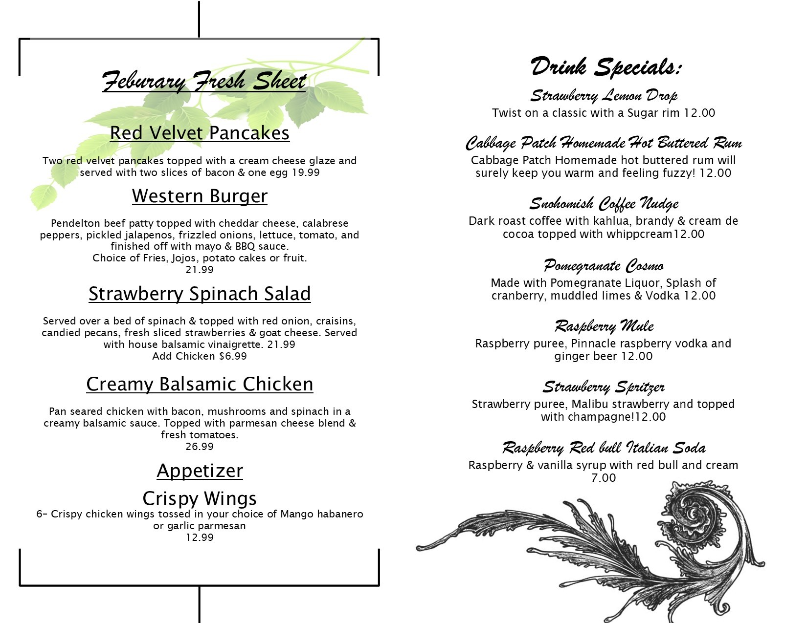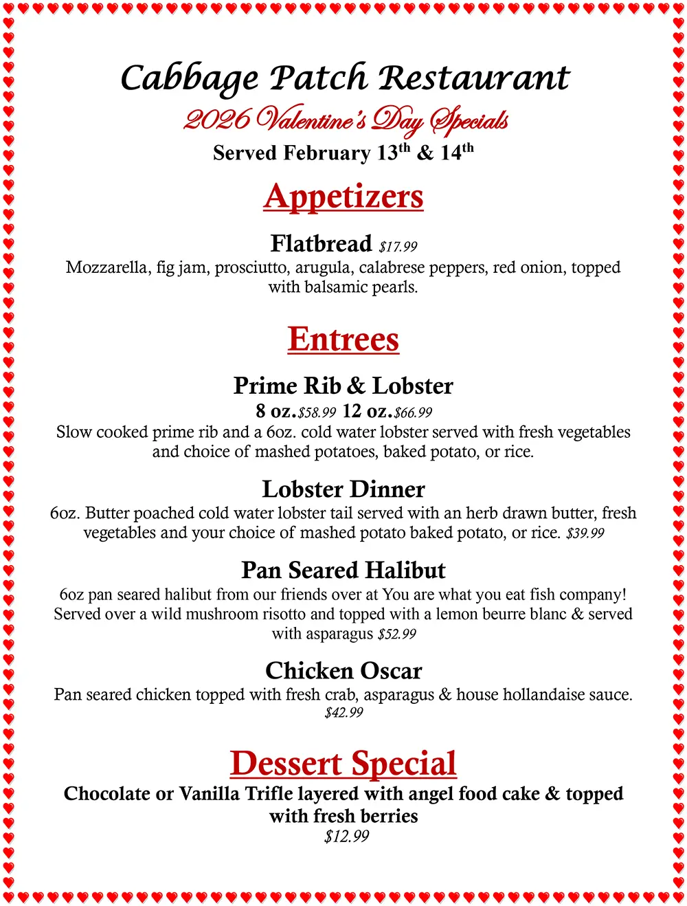 Warm up with Cabbage Patch Restaurant’s Fresh Sheet! Our chefs have crafted a delicious selection of seasonal dishes featuring the freshest winter ingredients. From hearty soups to comforting mains and decadent desserts, there’s something to satisfy every craving. Come in and enjoy the best flavors of the season today!